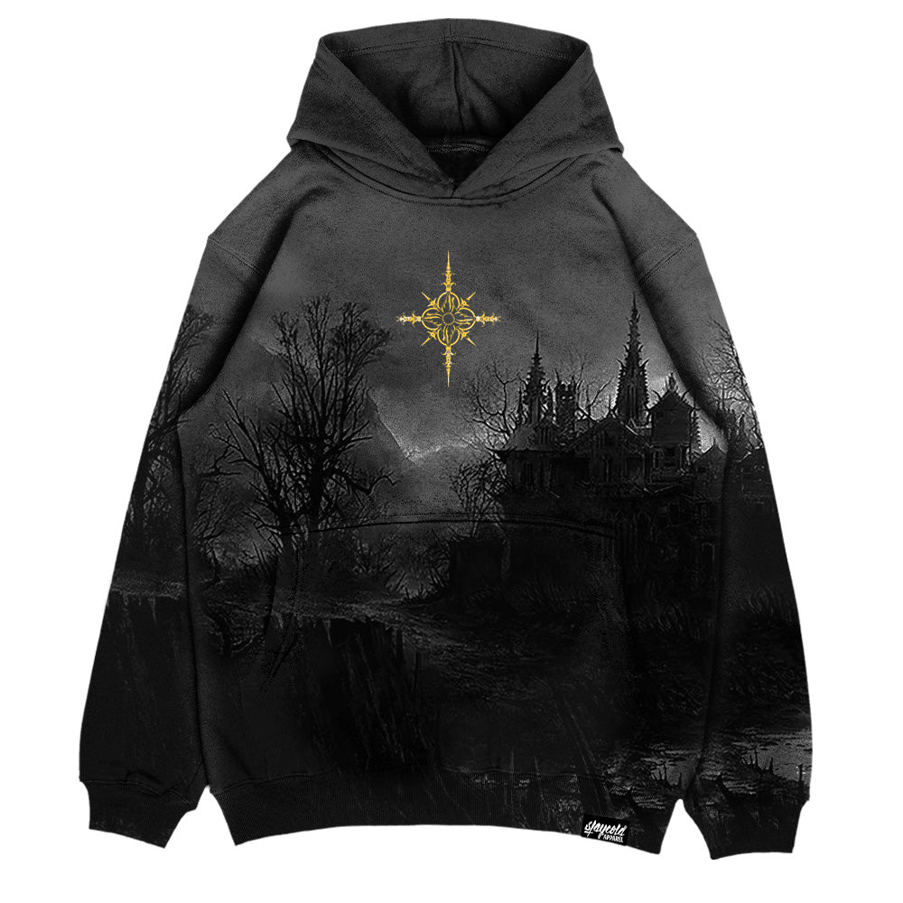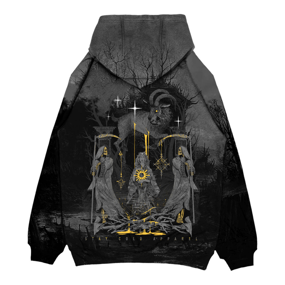 Our “Full Moon Ritual” Hoodie, featuring Andrey Lukovnikov‘s haunting artwork, channels the full moon’s mystical vibes, a powerful symbol of breaking boundaries and leveling up. This allover-printed masterpiece wraps you in an eerie, moonlit landscape, complete with a gothic ruin and ghostly barren trees, immersing you in a world of shadows and secrecy. This hoodie isn’t just about looks, it’s built for those who walk their own path with confidence.