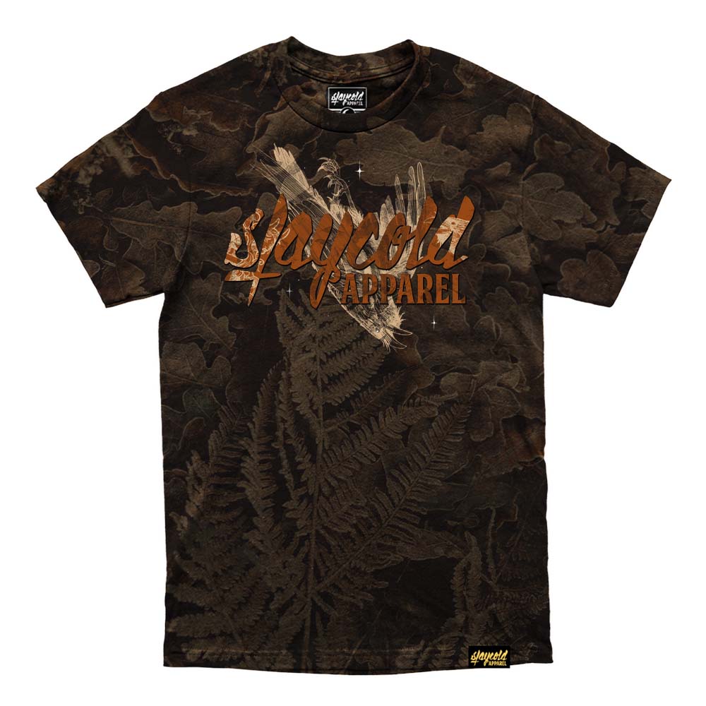 This piece features an all-over autumn leaf camo print in deep browns and earthy tones. It blends gothic storytelling with forest mysticism.