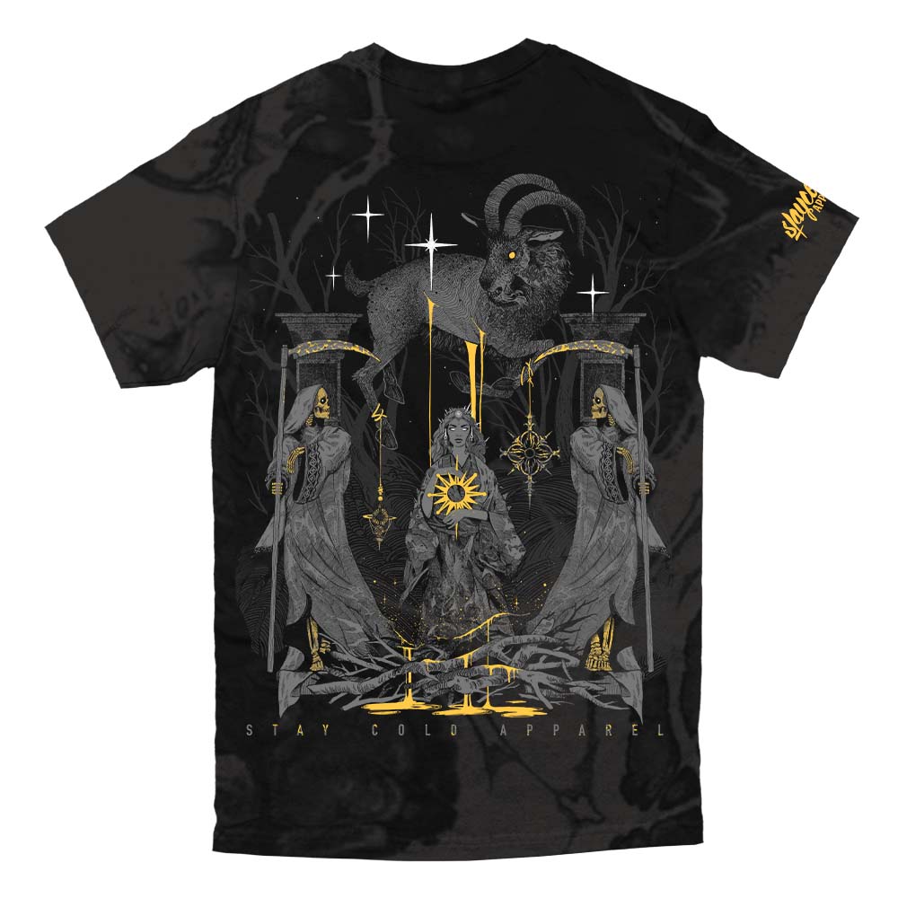 Drenched in lunar energy, the “Full Moon Ritual” T-Shirt blends dark mysticism with sharp rebellion. Designed by Andrey Lukovnikov, crafted with 200GSM 100% cotton, this piece channels celestial chaos, a cosmic dance of scythes, suns, and shadows. At the center, a powerful ritual unfolds under the gaze of the horned beast, wrapped in golden accents that blaze against the stormy black tie-dye background.