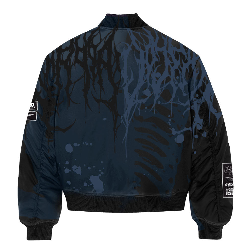 "This „Reign Of Blood“ Bomber Jacket is street armor for the fearless, and your new go-to for the cold days ahead. Nightblue clashes with black across the iconic „Reign Of Blood“ print, mirrored in reverse on each side for maximum impact.