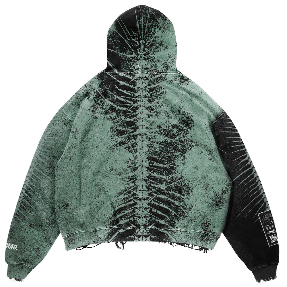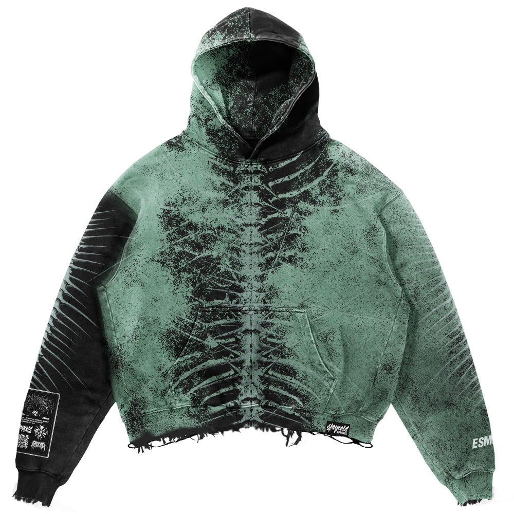 In our „Lineage Of Dusk“ Oversized Hoodie mentol and black collide, wrapping you in shadow, while skeleton prints crawl across chest, back, arms, and hood for full-on ghostly X-ray vibes. Each tear and fray is deliberate, a statement against the sterile world of conformity. 400gsm of pure, heavyweight cotton, oversized for maximum presence. „Lineage Of Dusk“ is a whole-ass manifesto. Stay cold, flex different, and make modern society’s bones shake.