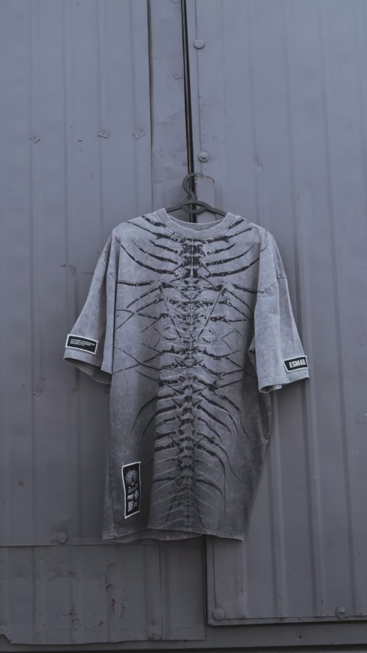 The Lineage Of Dusk Shirt doesn’t just show up, it stands its ground. The grey acid-washed finish gives it a raw, weathered edge, while the print of twisted spines slashes across the fabric like a warning, chaotic, sharp, and impossible to ignore.