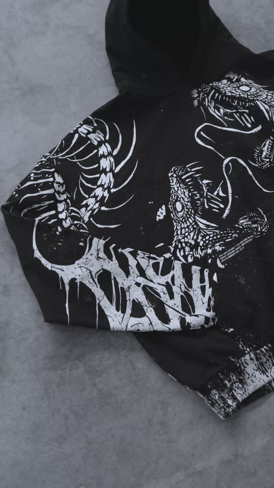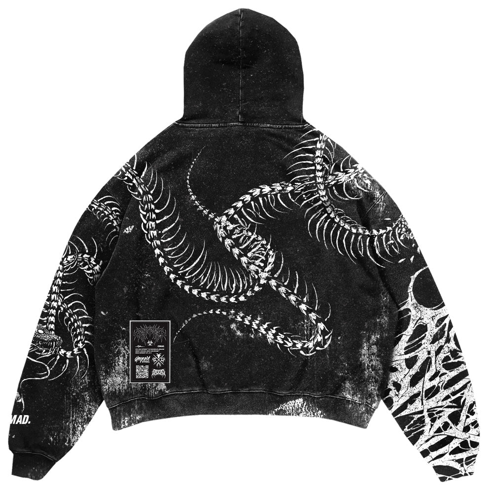 "Black Spine" is 400GSM of heavyweight cotton menace. Jet black, unevenly dyed like it`s been dragged through bad decisions. A skeletal snake coils across the hoodie, crawling over your body like it`s alive, alert, and absolutely judging everyone in your radius. A Death-metal lettering rips down the sleeve, the pouch flexes the identity label, and the ESMAD embroidery quietly says yeah, I know what I`m doing. Flip around and the woven back patch finishes the look like a signature on a warning label. Oversized, raw, and unapologetically dark: an armor for anyone who wants to flex with a little venom.