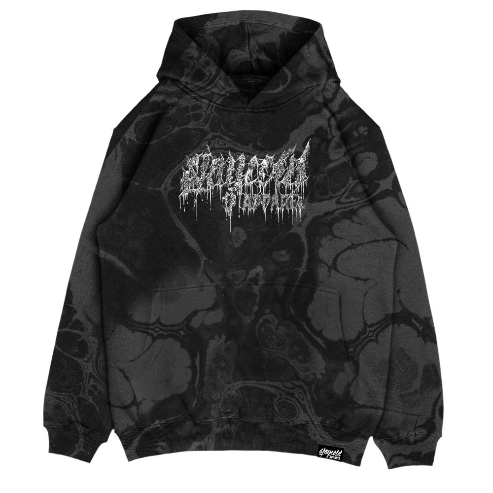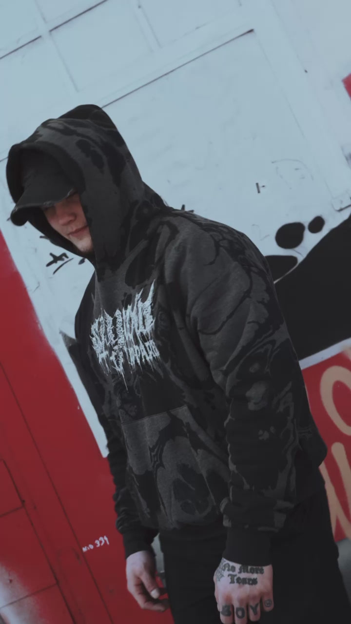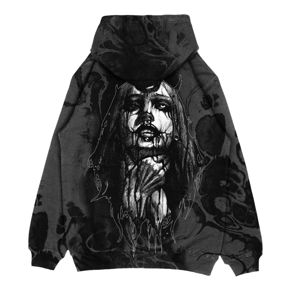 This Hidden Champion, created by our friend and tattoo artist Miguel Camarillo, depicts a self-strangling woman, a chilling representation of the inner turmoil that can consume us all. This hoodie is more than just a piece of clothing; it’s a powerful symbol of the struggles we all face in life. It’s a reminder that sometimes our own worst enemy can be ourselves and that we must confront our inner demons to find peace and inner strength. The fabric features a unique, organic bleach effect, reminiscent of flowing marble patterns. This adds a dark, artistic touch, enhancing the raw and emotional depth of the design..