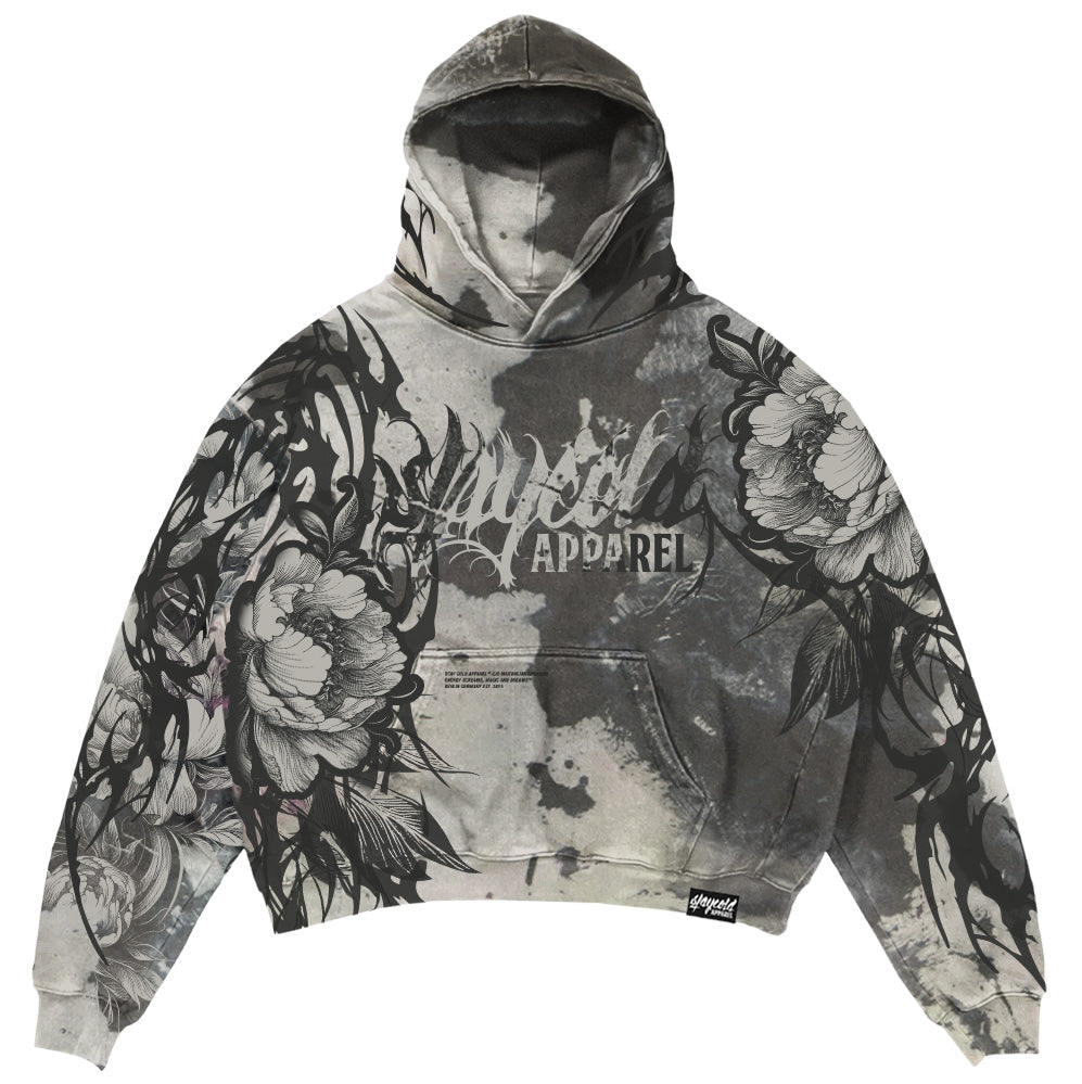 "Veins of Velvet" is your armor for the colder months - a 400GSM heavyweight hoodie drenched in a grungy, dyed-allover aesthetic. Tribal lines and beautiful florals pulse across the fabric like inked veins, wrapping sleeves, shoulders, and shadows alike. It`s beauty laced with danger, softness carved in chaos. This hoodie reminds you that even the most delicate things bleed- even the delicate carry darkness. Finished with a clean-edged custom patch and full front & back screenprints, this piece doesn`t whisper, it wraps you in its myth and dares you to wear it loud.