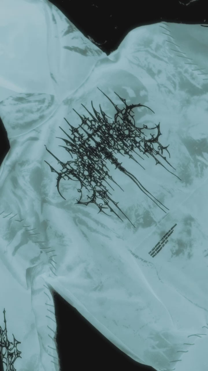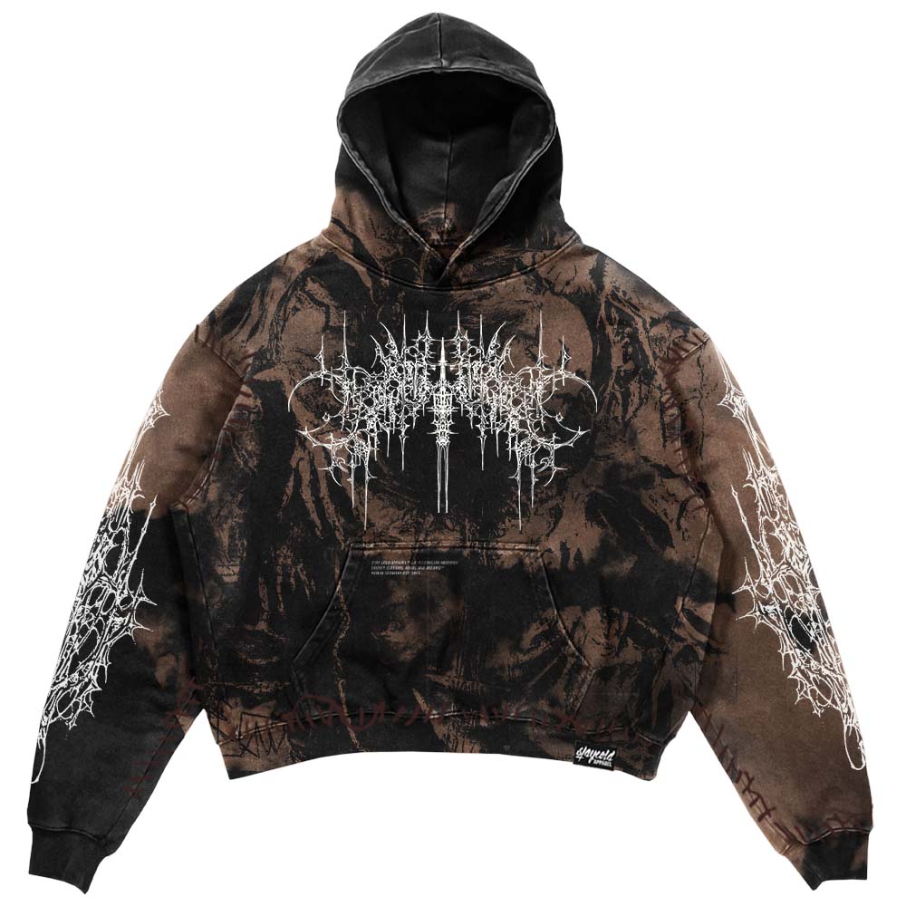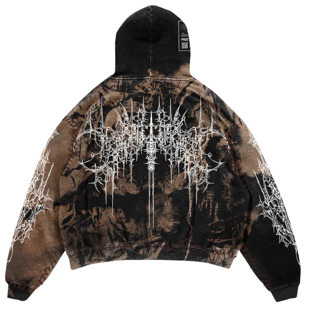 Built from an upgraded 400GSM 100% cotton, it brings brutal comfort and battle-ready weight. The massive allover discharged print carves chaos into every inch, while embroidered tribals on the front, back, and sleeve marks you as part of something unholy. The clean-edged woven patch on the hood is the final seal, like a sigil etched in the ruins.