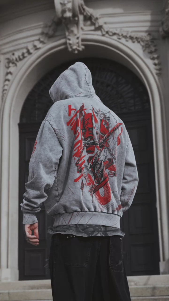 This grey hoodie isn’t just a fit, it’s a full-blown war cry. Featuring a brutal artwork by Snoop that slaps you in the face with raw power: a demonic Oni mask pierced by a katana, wrapped in venomous snakes and crowned with skulls.