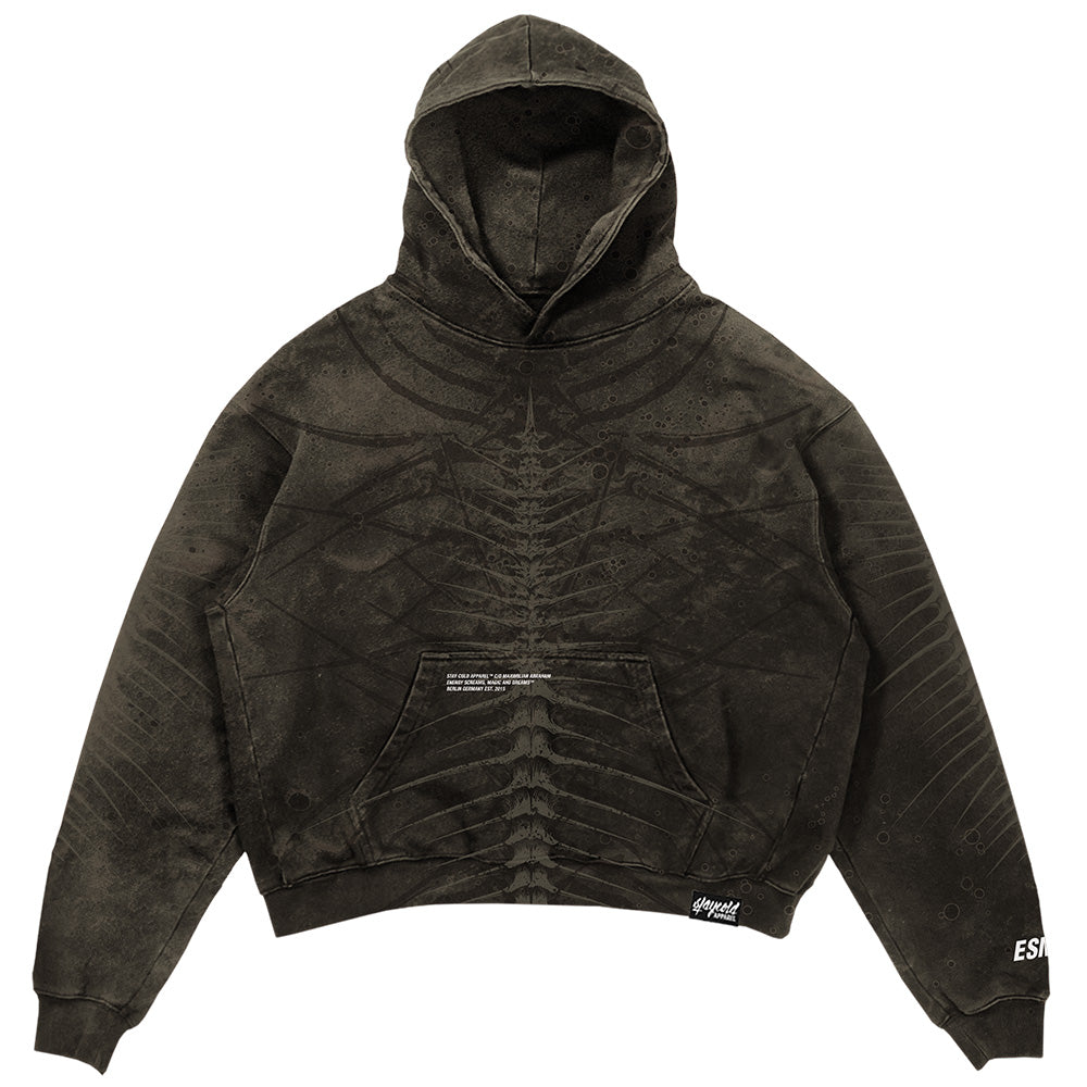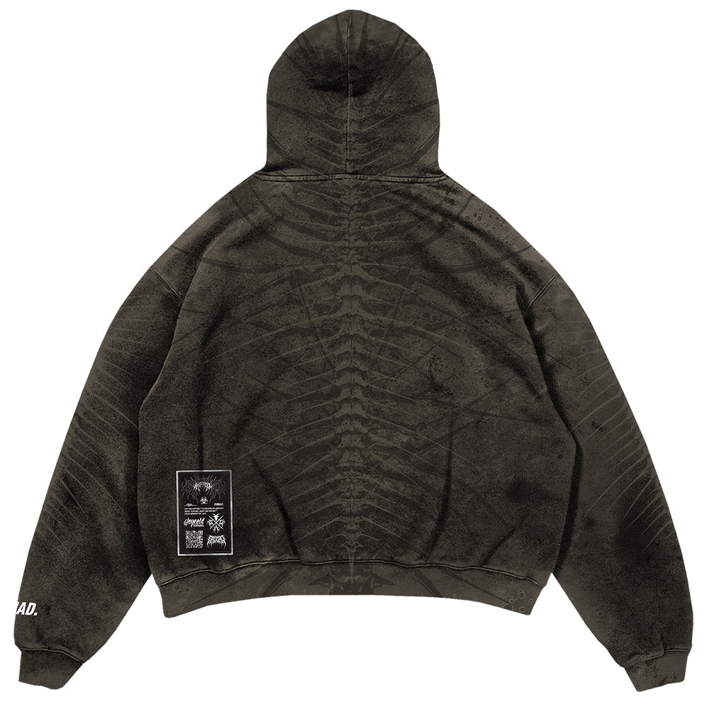 Crafted and built with a heavyweight 400GSM fabric, this hoodie doesn’t just keep you warm - it commands attention. The acid-washed finish creates a raw, otherworldly vibe, while the massive all-over discharged prints feel like a story ripped straight from the edge of reality. A custom woven patch with razor-sharp edges adds a sleek touch of precision to the chaos.