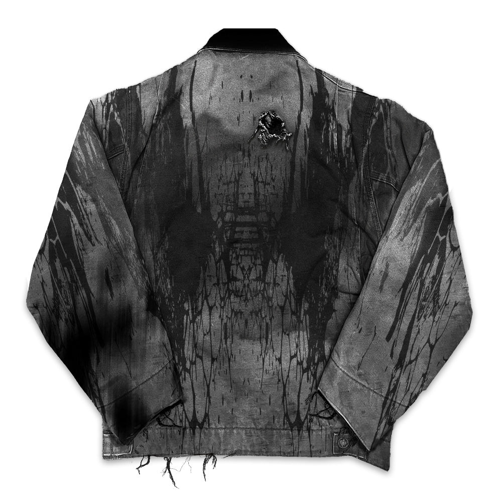 Born from the ashes of burnt-out factories and broken promises, "Ash Grid" is dark grey denim that looks like it survived an anarchy of style. Tattered edges, distressed holes, and a black hatched allover print make every angle chaotic perfection. Custom silver buttons punctuate the destruction, while identity prints whisper stories of rebellion only the bold can read.