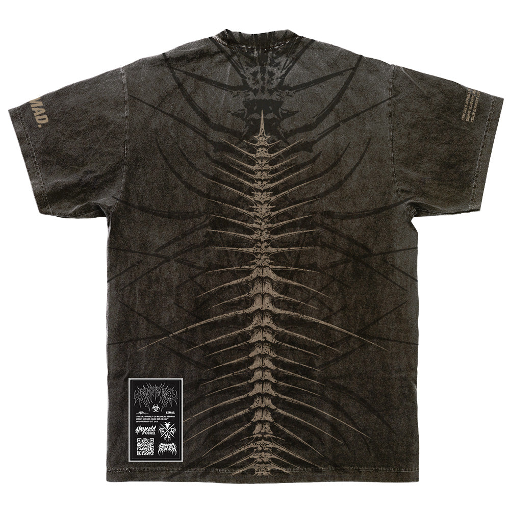 Oversized and heavy at 250GSM, our "Lineage Of Dusk" Shirt drapes like armor, demanding space, attention, and respect. This shirt doesn`t apologize; it remembers what strength feels like when the world has none. Acid-washed cotton in earthy oak and black gives it a worn, lived-in weight, while the jagged, blade-like spine runs across front and back like a warning: I have edges, and I will not bend. Identity and ESMAD logos on the sleeves mark the lineage. Every line, every edge is a reminder: some carry backbones when no one else does.