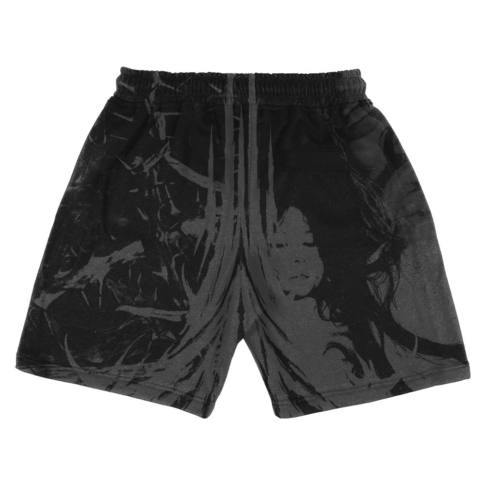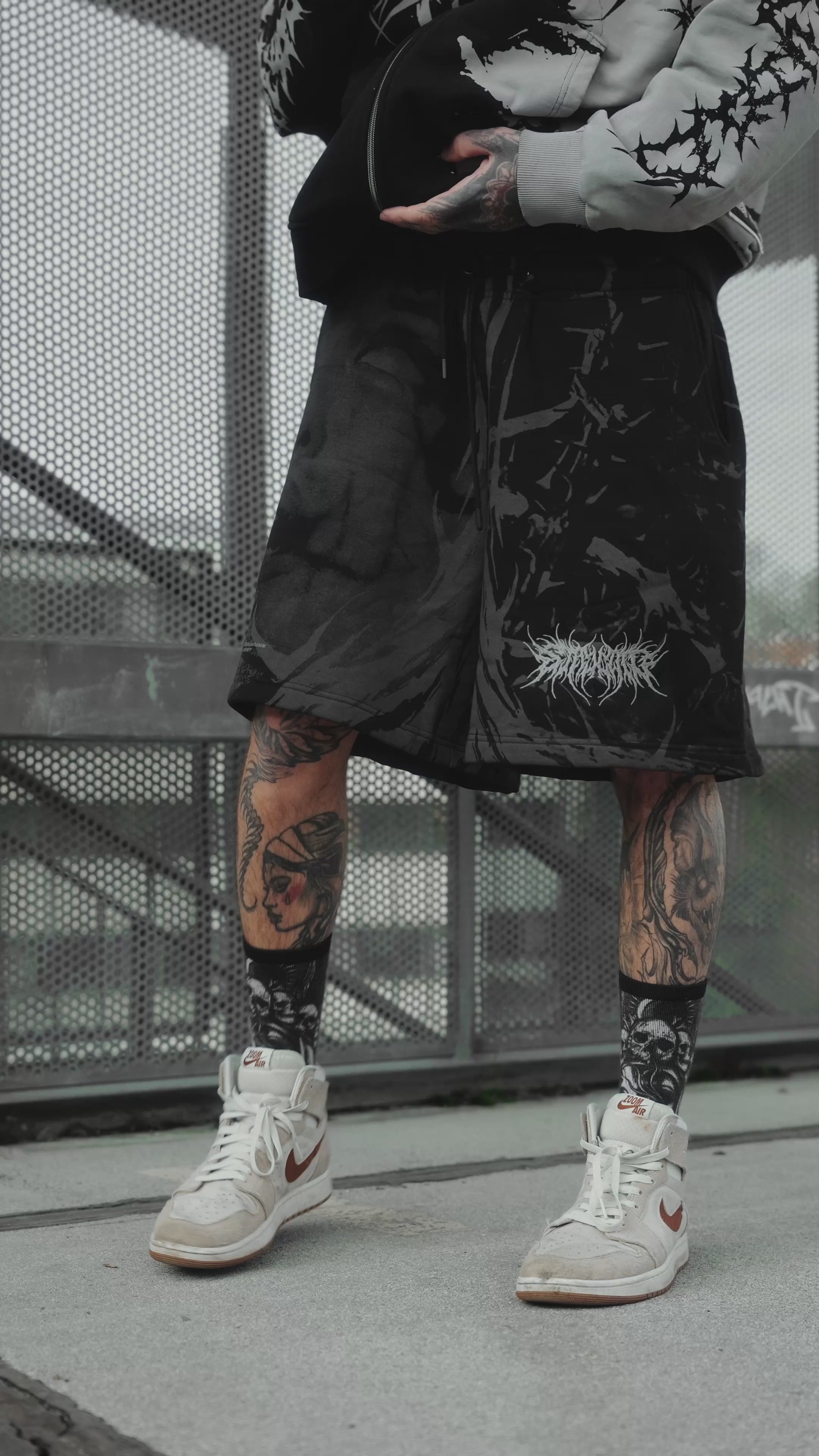 Your legs deserve more than sidewalks, they deserve a throne in the underworld. "Blackwater" Prime Shorts are crafted from thick, soft 100% cotton, built like armor for street-level demons. Black as a void, with dark grey prints crawling across the fabric, subtle enough to confuse the normies, loud enough to make them blink twice. "Stay Cold" death-metal embroidery slashes one leg, while the identity print marks the other, proof you`re playing by your own rules. High-quality, gory, and ready for maximum menace, these shorts bring streetwear to the next level.